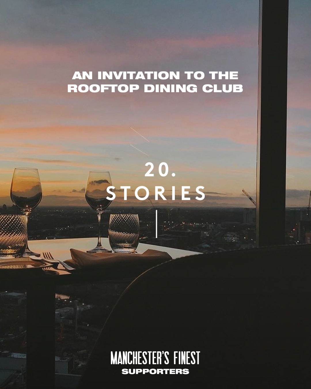To join the 20 Stories Rooftop Dining Club you first need to become a Manchester’s Finest Supporter. To become a supporter hit the blue ‘Become a Supporter’ button on our Facebook page and you’ll get access to the private supporters hub – in here you’ll find instructions on joining the Rooftop Dining Club.