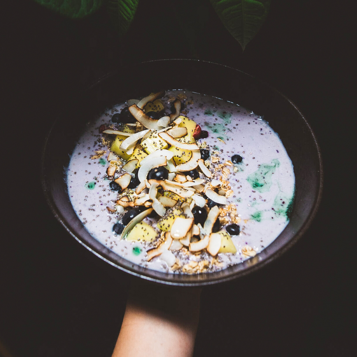 Nam’s Smoothie Bowl // Lychee and Coconut smoothie, mango, blueberries, granola, burnt coconut and chia seeds.