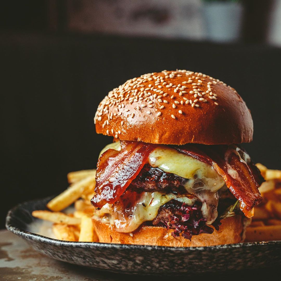 Tariff & Dale / Bacon double cheeseburger, smoked applewood cheddar, maple bacon