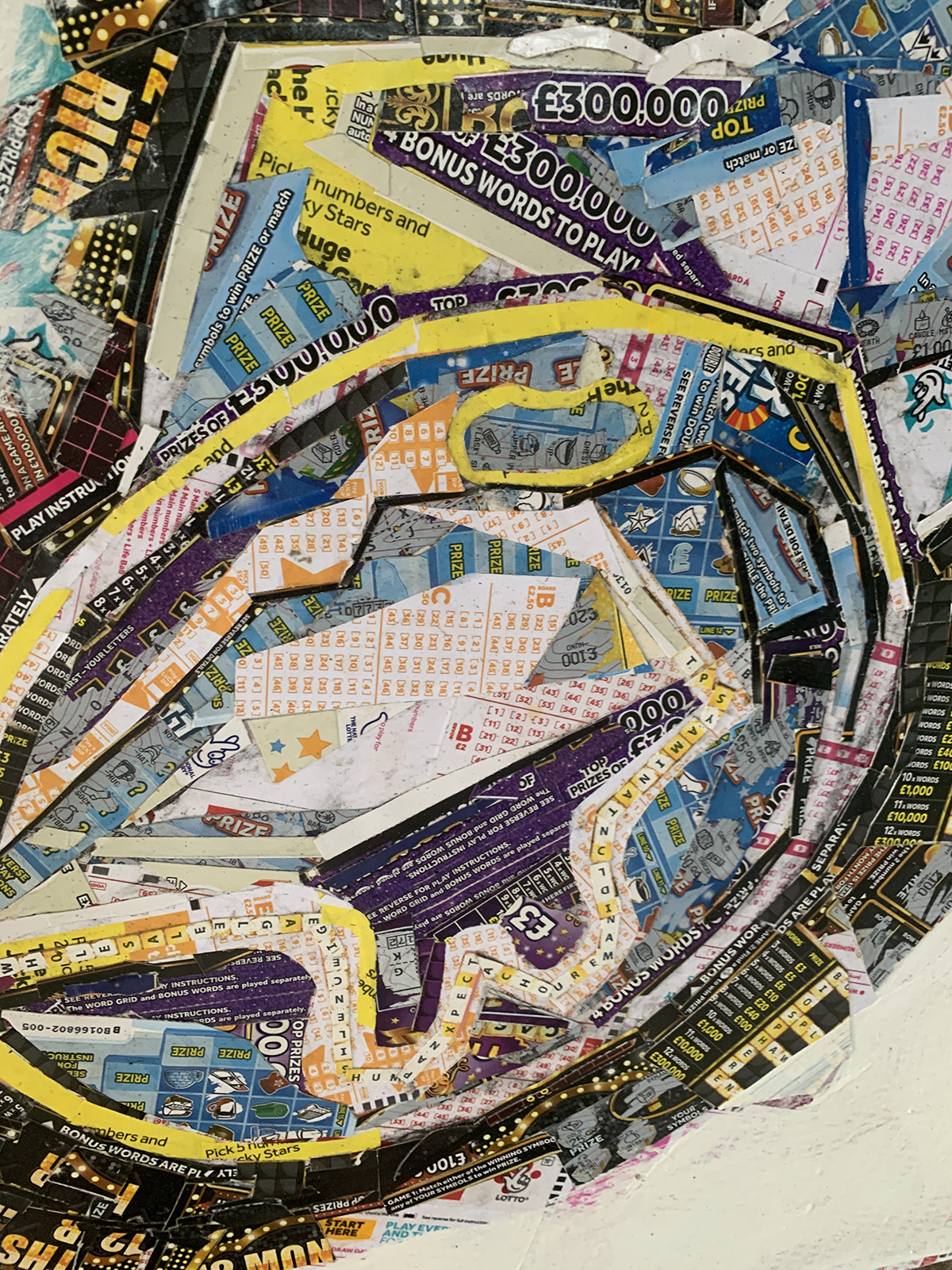 “Lottery tickets represent those few seconds of dreaming whilst the numbers are checked. Then it’s all over. The dreams of money. So, I thought, I’ll set myself a budget of £99 to produce this whole exhibition. The one at Ardwick cost too much – even the cost of the oil paint was a lot. Thrown away lottery tickets, discarded doors… So far it’s only cost £24 so I’m way under budget. I’ve even made the glue myself.” Danny smiled triumphantly.