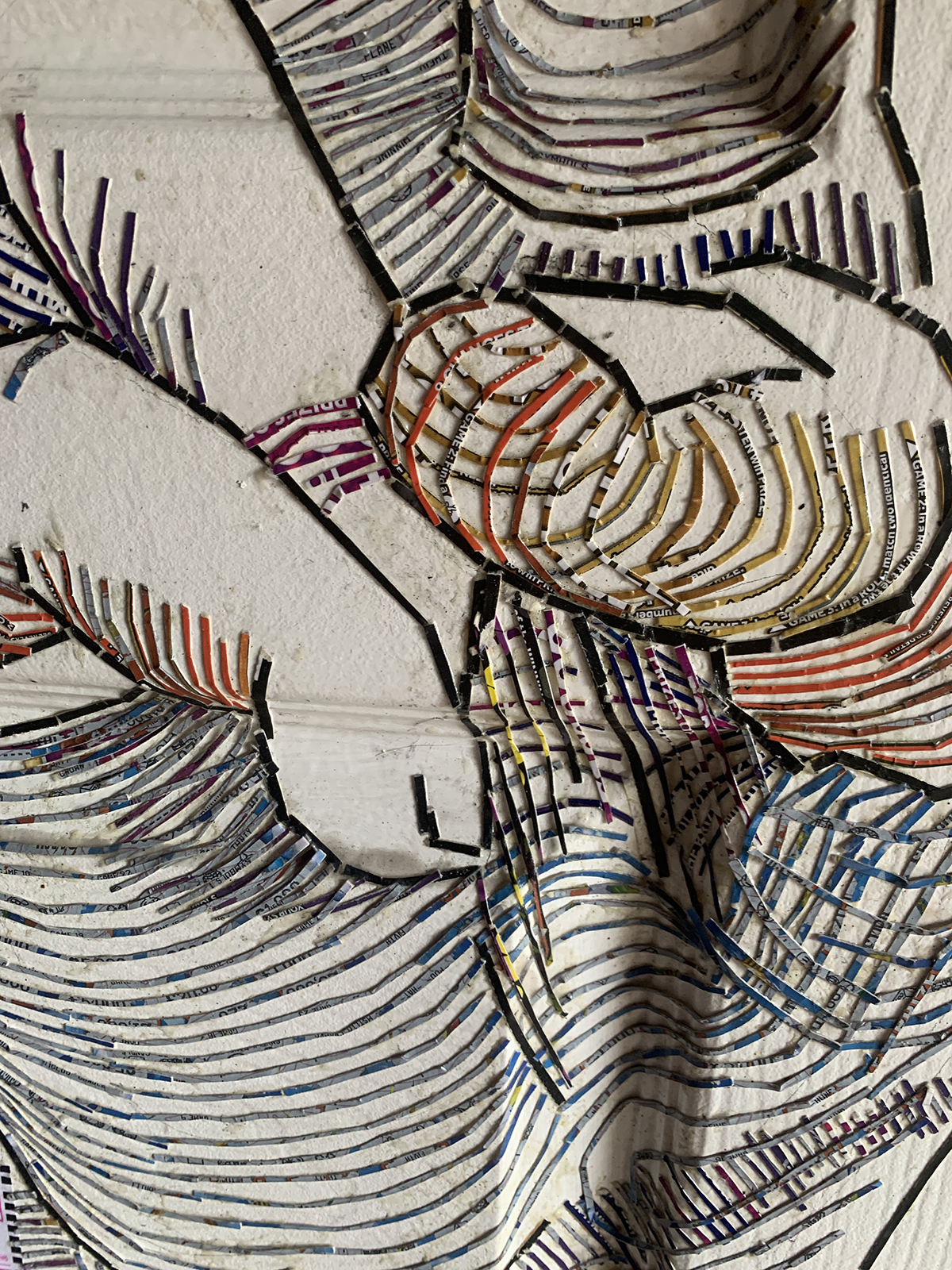 It was here that Danny showed me his sketch book, simple iconic day-to-day images – a teddy bear, a church, a shopping bag – and (tried) to explain how he had persuaded local shops to collect discarded lottery tickets and had then spent hundreds of hours recreating those iconic drawings in collage strips of lottery tickets on to everyday ‘backdrops, bases.’ Like a discarded door or a municipal sign.