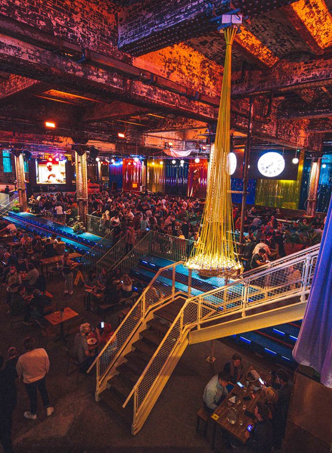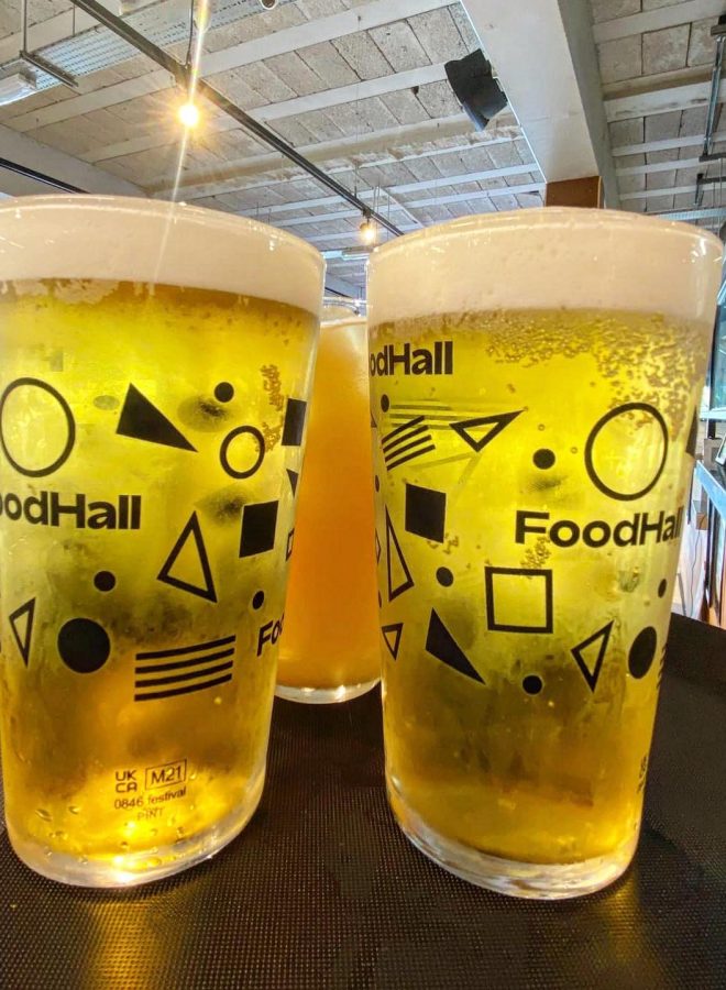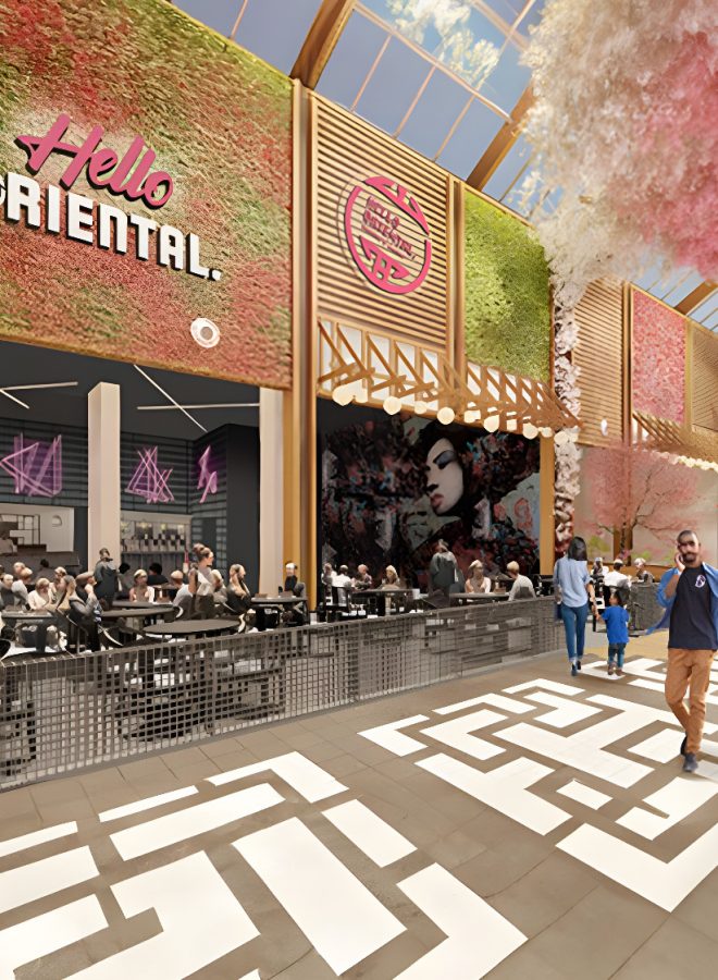 Food hall featuring stands doling out global street foods, craft beer and cocktails
