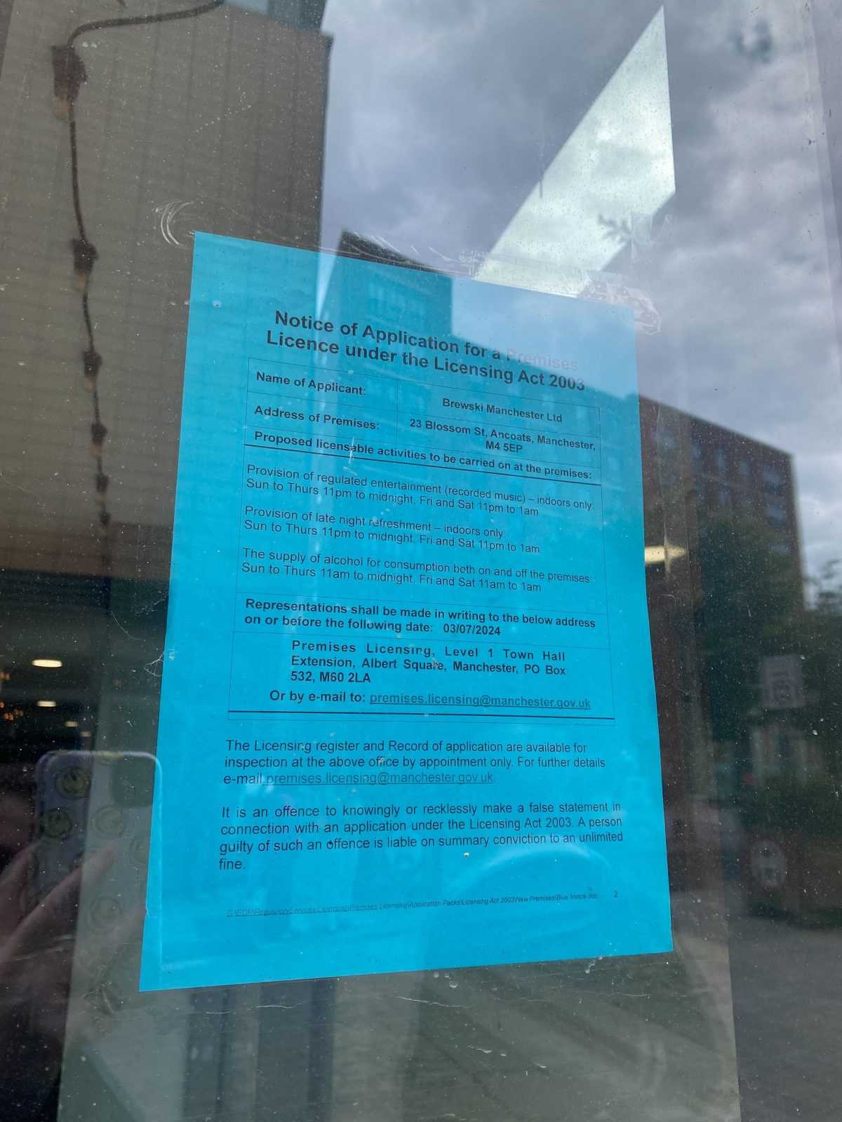 The notice unit, at 23 Blossom St, reveals they plan to serve ‘late night refreshments’ until midnight on Sunday to Friday, and 1am on a Saturday, alongside alcohol too.