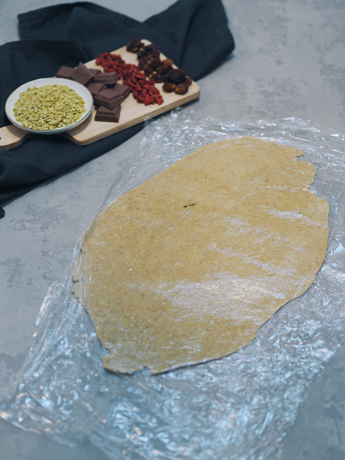 3. Roll the dough in your hands to form a ball and sandwich this between two pieces of cling film. Using the rolling pin, roll this out to around 1cm in thickness and place in the fridge for around 30 minutes to chill.