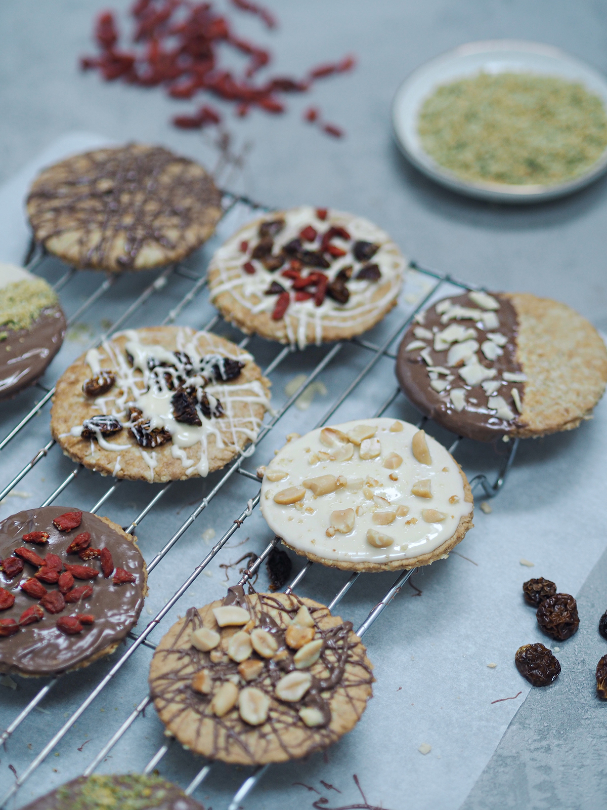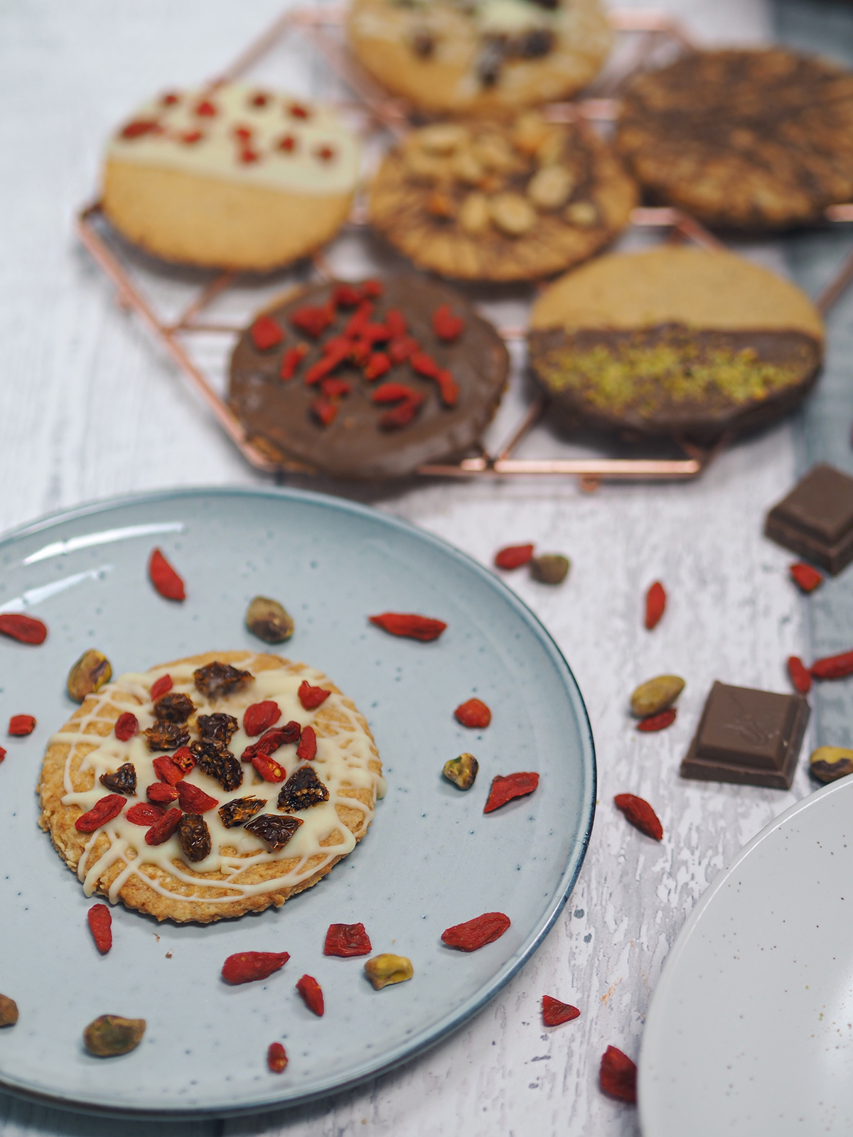 8. Melt both the white and milk chocolate separately, crush the pistachios and cut up the dried fruit. Using a variety of designs, decorate your biscuits as you like – you can literally add anything to them, trust me it’ll only enhance the biscuit flavour!