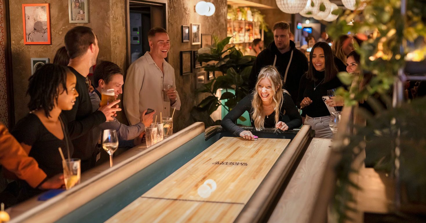 Inside, the decor is a mix of industrial and art deco styles spread over 11,000 sq ft of space, with 15 shuffleboard play spaces and capacity for 450 people.