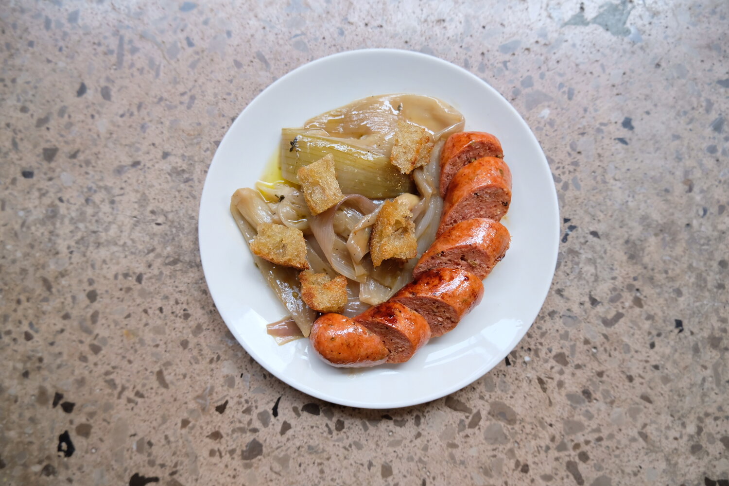 Fermented pork, fennel and chilli sausage, braised onions and fried bread