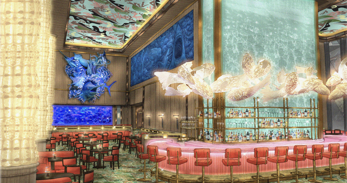 Other architectural features in the building, currently secreted behind huge hoardings, will be a one-of-a-kind destination bar made from ‘glowing pink onyx and glass, set against a backdrop of a cascading waterfall’. There will also be private dining room with its own aquarium full of exotic tropical fish.