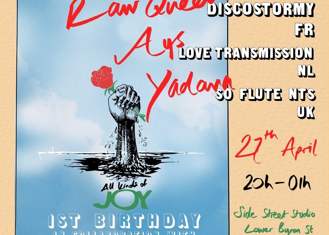 NAM Sound System returns to Side Street Studio on Saturday 27 April to help celebrate All Kinds Of Joy’s first birthday. Joining them on the decks will be Ays and Raw Queen. Expect the usual mix of all kinds of joyful sounds, from gospel, disco and boogie through to spiritual jazz, house and anything else in between.